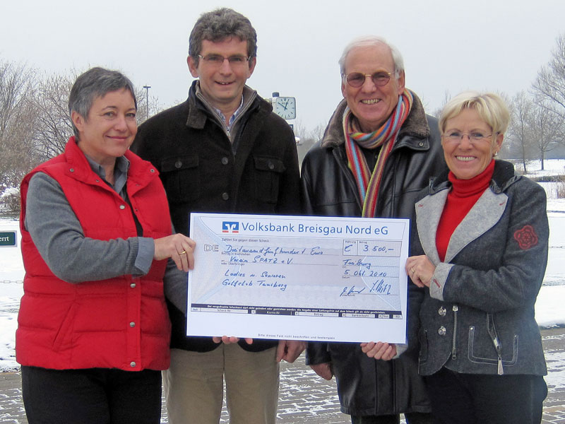 Zum Abschluss der Saison 2010 spielten die Ladies sowie die Senioren des Golfclubs Tuniberg im Oktober ein Charity-Turnier zugunsten des Vereins SPATZ. Nach Abrechnung aller Spenden überwiesen die federführenden Golferinnen den Betrag von 3.500,-- € an unseren Verein. Stellvertretend für das SPATZ-Team bedankte sich Ute Knoll dafür, dass der Erlös dieses Turniers nun bereits zum zweiten Mal unsere Angebote für die erkrankten jungen Patienten und ihre Familien unterstützt. Ein Dankeschön ging auch an Golfclub-Manager Klaus Pfannkuch und seine Mitarbeiterinnen für die Durchführung des Turniers.