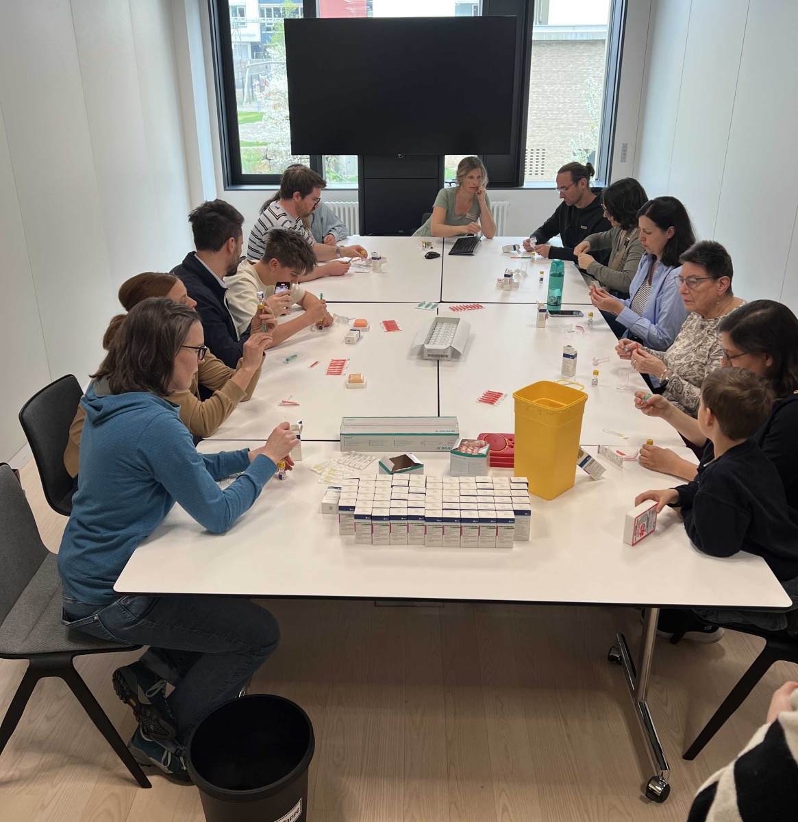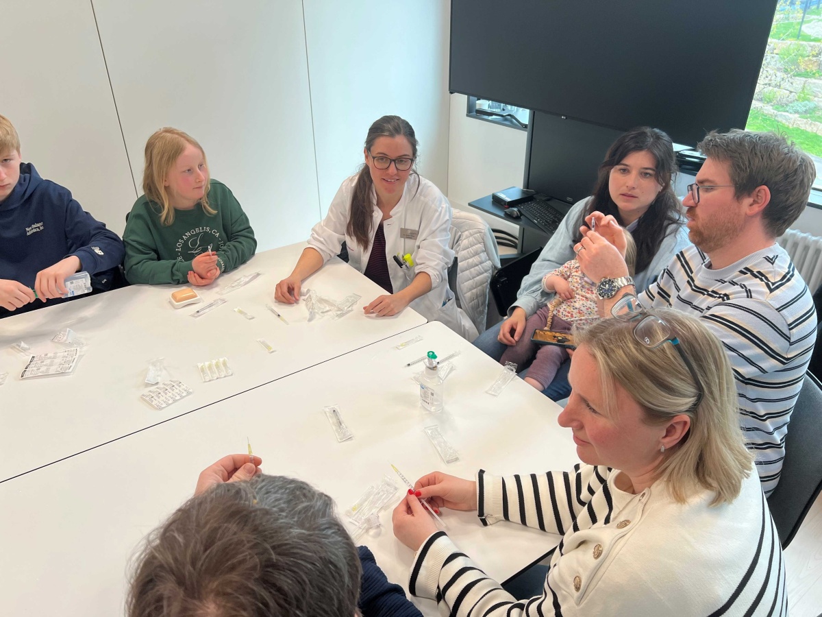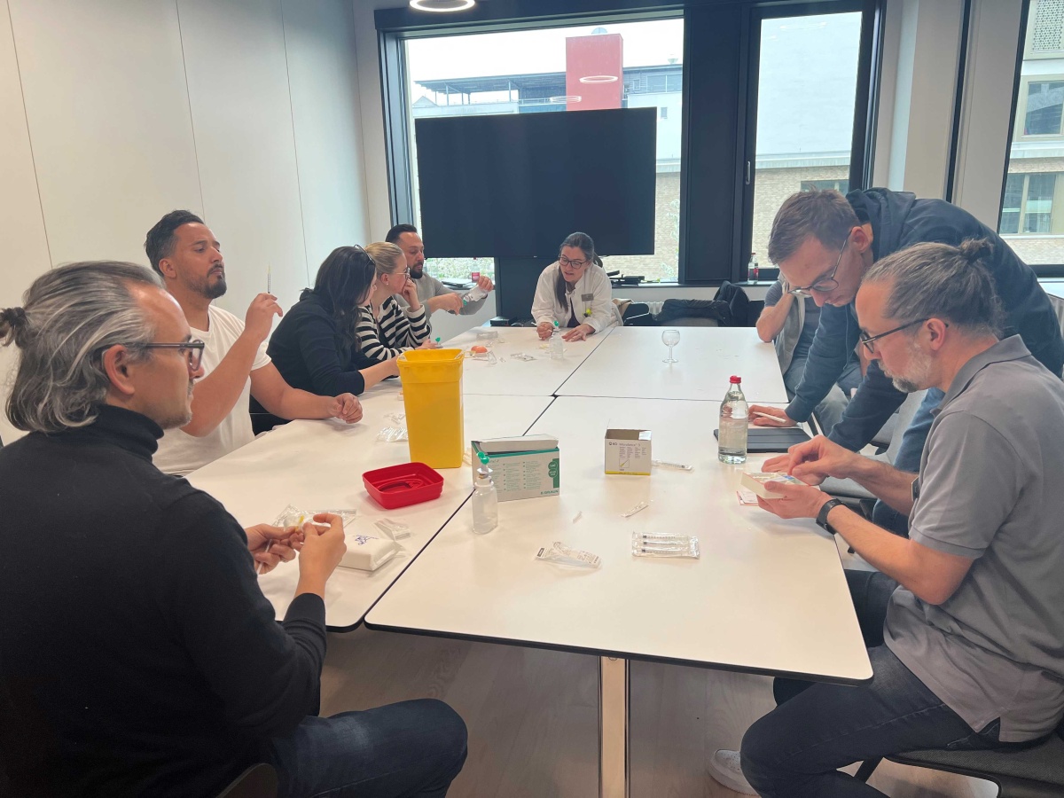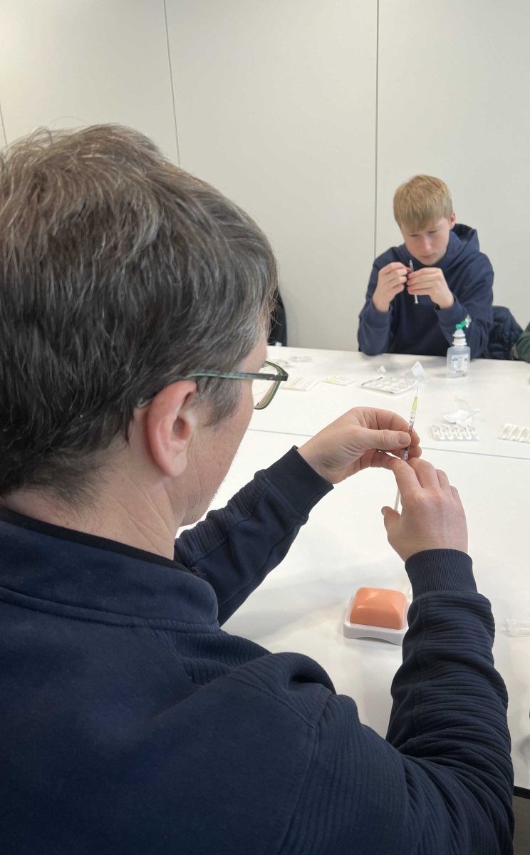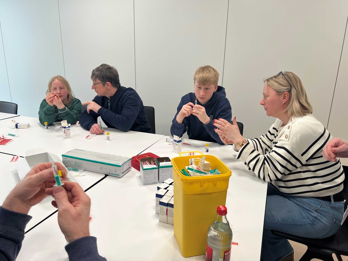 Mit großem Interesse wurden dann Schulungsvideos zur Verabreichung von Notfallspritzen verfolgt. Was nun im Video gezeigt und erklärt wurde, sollte nach einer Pause auch in die Praxis umgesetzt werden. Eine Gruppe konnte sich mit Spritzen und Nadeln ausrüsten, die Spritzen mit Kochsalz zur Übung aufziehen, und in ein Gummikissen spritzen oder sich selbst verabreichen. Parallel übte eine Gruppe das Aufziehen der Notfallspritze. Zu jeder Zeit saß das Endo-Team um Prof. Kamrath mit am Tisch und hat Hilfestellungen gegeben und Fragen beantwortet.