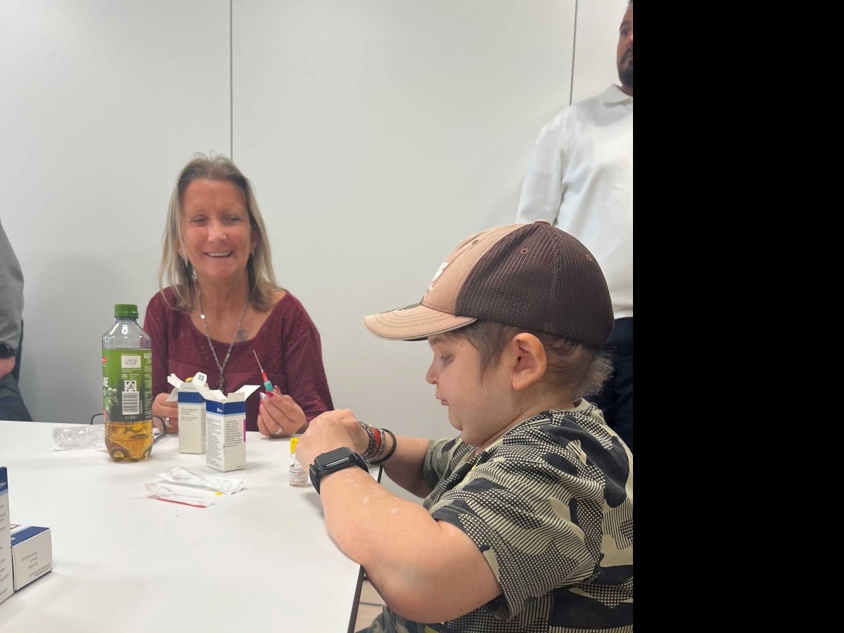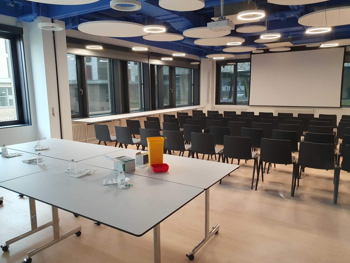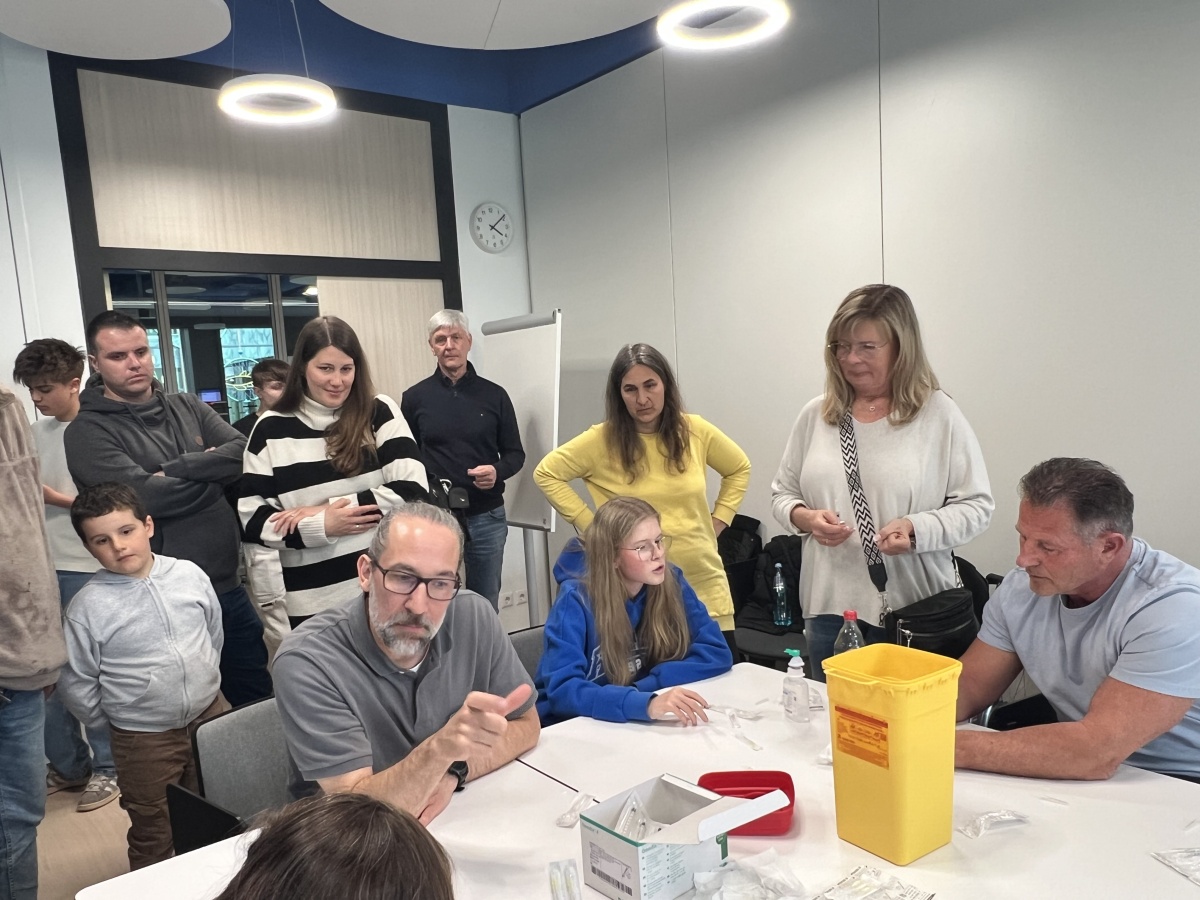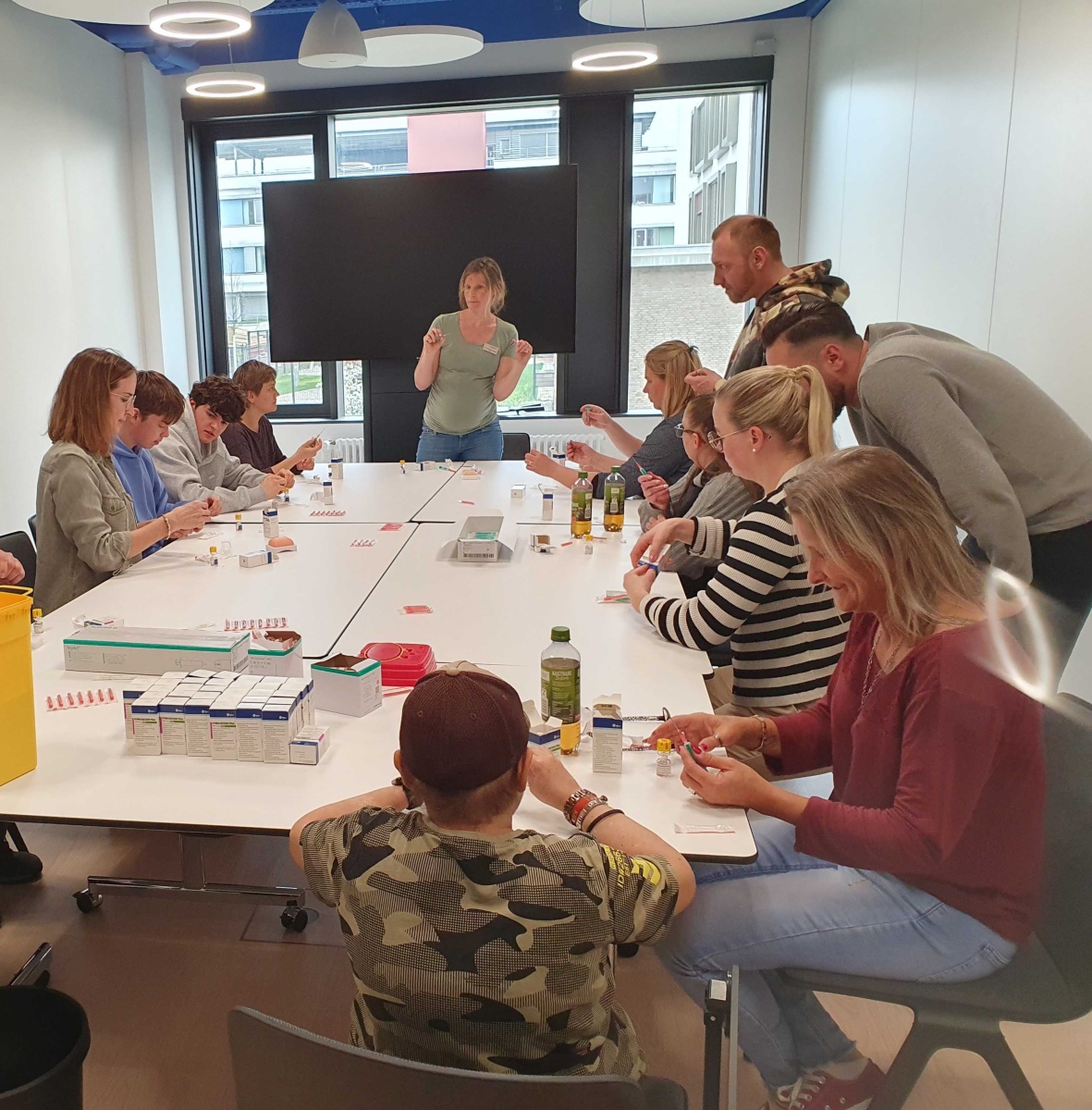 Mit großem Interesse wurden dann Schulungsvideos zur Verabreichung von Notfallspritzen verfolgt. Was nun im Video gezeigt und erklärt wurde, sollte nach einer Pause auch in die Praxis umgesetzt werden. Eine Gruppe konnte sich mit Spritzen und Nadeln ausrüsten, die Spritzen mit Kochsalz zur Übung aufziehen, und in ein Gummikissen spritzen oder sich selbst verabreichen. Parallel übte eine Gruppe das Aufziehen der Notfallspritze. Zu jeder Zeit saß das Endo-Team um Prof. Kamrath mit am Tisch und hat Hilfestellungen gegeben und Fragen beantwortet.