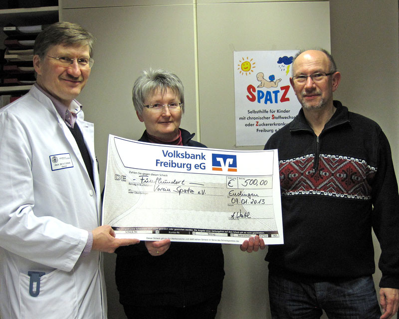 Angelika Waibel als Vorsitzende und Hartmut Waibel als Rechner des Kirchenchores Kiechlinsbergen überreichten einen symbolischen Scheck über 500,- Euro an Prof. Dr. Karl Otfried Schwab (links). Der Kinderdiabetologe und -endokrinologe am Zentrum für Kinder- und Jugendmedizin in Freiburg nahm die Spende für den Verein SPATZ Selbsthilfe für Kinder mit chronischer Stoffwechsel-, Hormon- oder Zuckererkrankung e.V. entgegen, der von ihm mitgegründet worden ist. Der Chor St. Petronilla spendete den Erlös eines Konzertes im Dezember in der Kaiserstuhl-Gemeinde. Prof. Schwab bedankte sich und versicherte, dass der Betrag direkt der Unterstützung der kleinen Patienten im Umgang mit ihrer chronischen Erkrankung zugunsten kommen werde. Der SPATZ betreut betroffene Kinder in ganz Südbaden.
