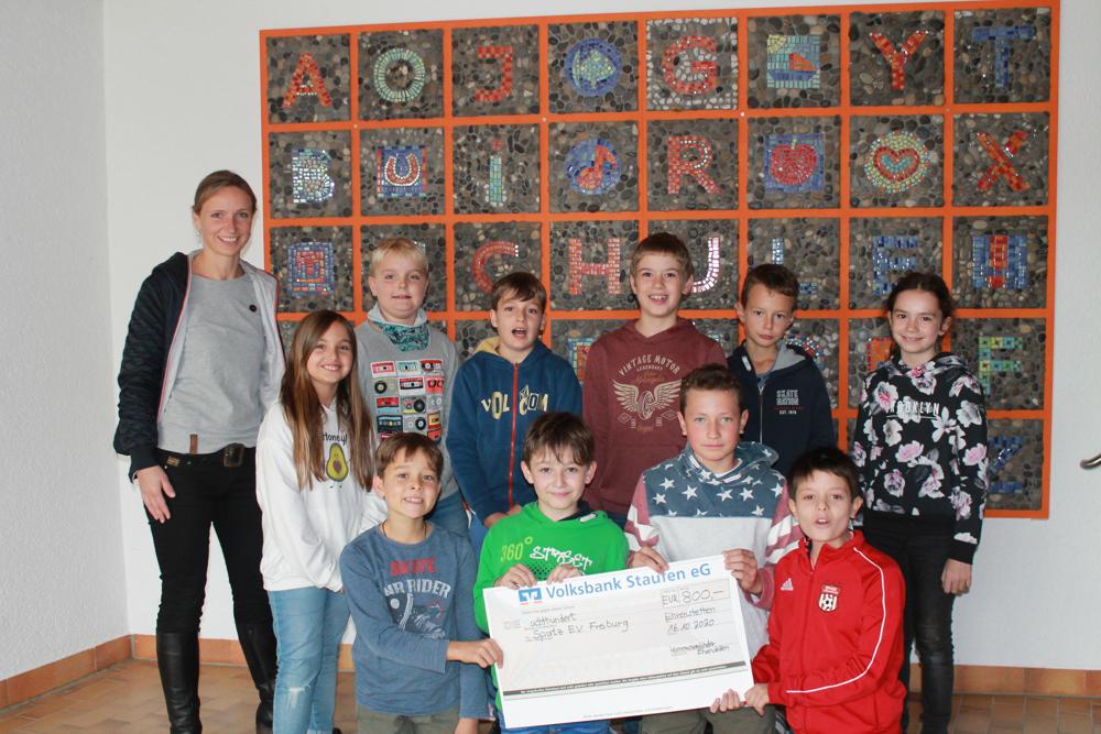 Die Kinder aus Ehrenstetten durften, situationsbedingt etwas verspätet, ihre Kommunion feiern und überreichten anschließend dem Spatz einen großen symbolischen Scheck - die stolzen 800 Euro wurden bereits überwiesen.