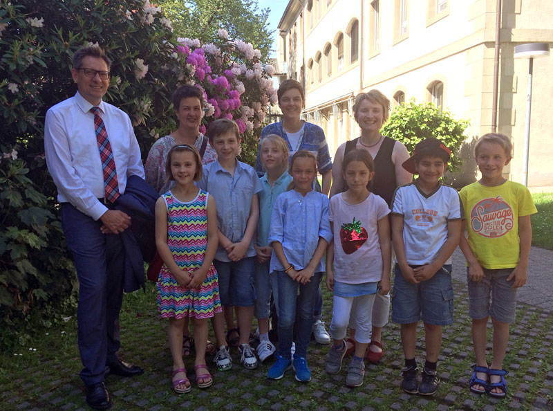 Besuch im SPATZ-Büro in der Kinderklinik - Sieben Jungen und Mädchen, die in diesem Frühjahr in Malterdingen und Hecklingen ihre Kommunion gefeiert hatten, kamen in Begleitung von drei Müttern und einem Vater zu Besuch in die Kinderklinik und ins SPATZ-Büro. Symbolisch überreichten sie eine Spende über 380 Euro, die bereits vorab auf dem SPATZ-Konto eingegangen war. Ute Knoll nahm die Besucher beim Haupteingang in Empfang und machte einen kleinen Rundgang mit den Gästen, bevor auch Prof. Schwab alle begrüßte und sich ebenfalls für die gute Idee bedankte.