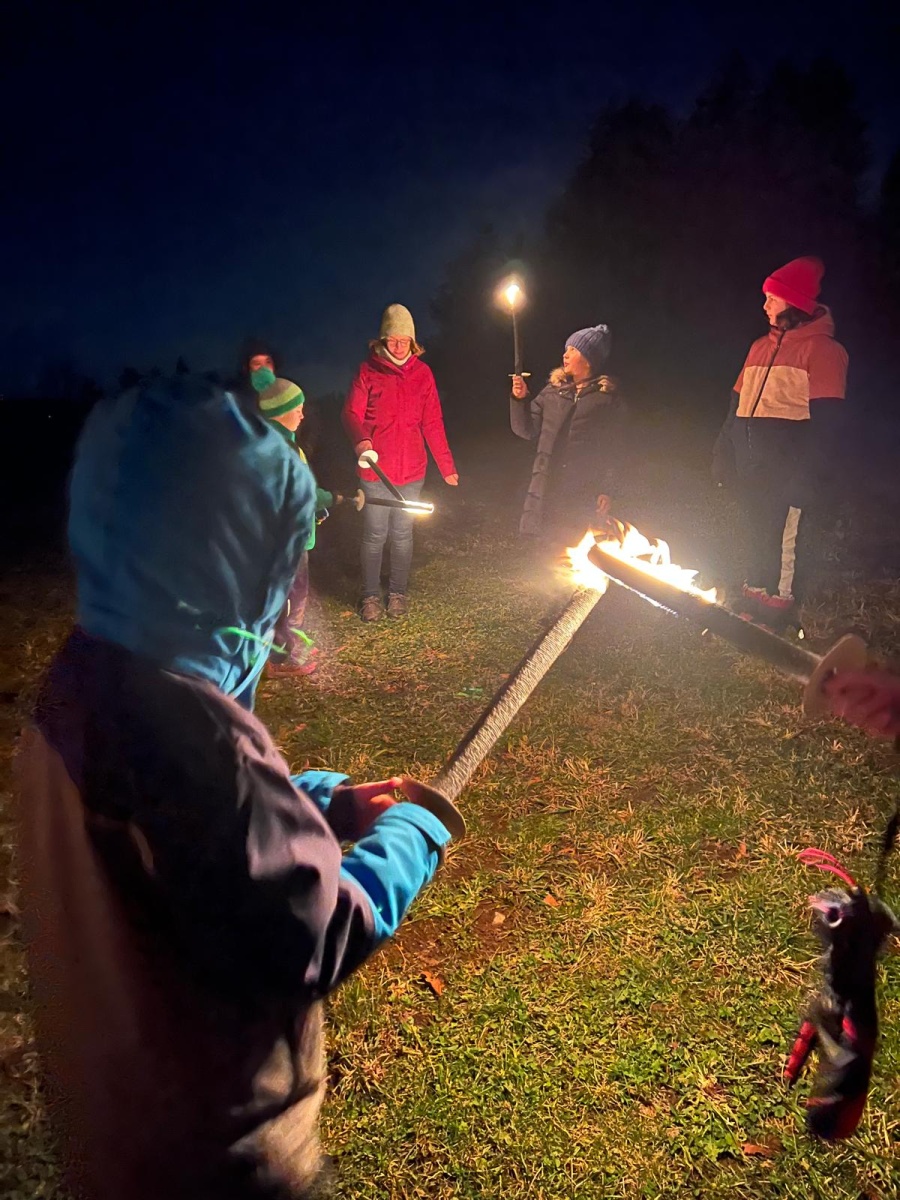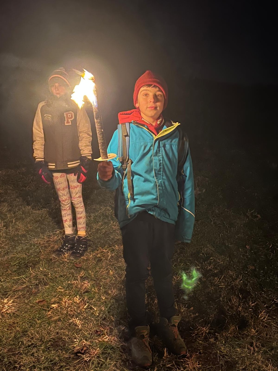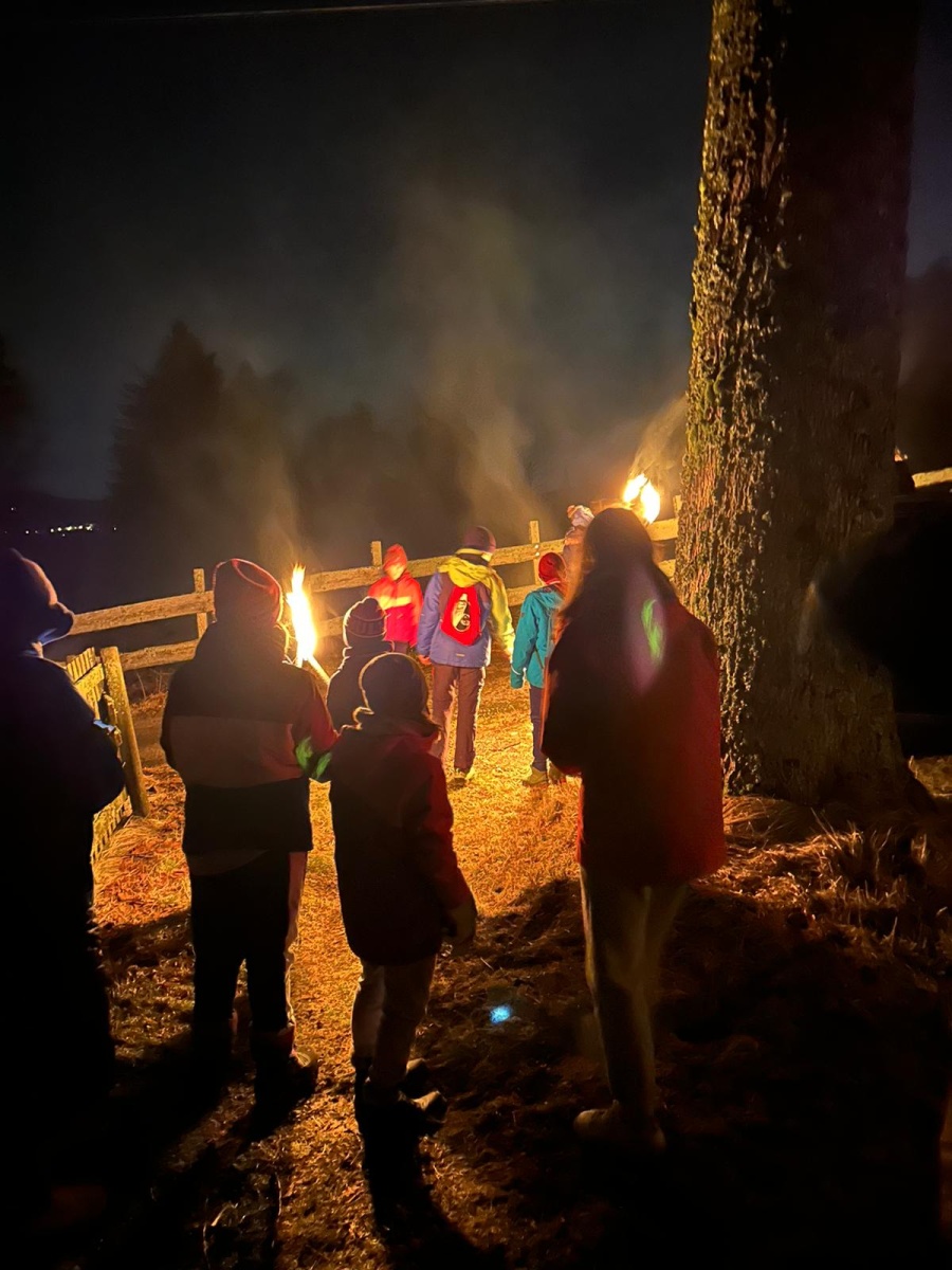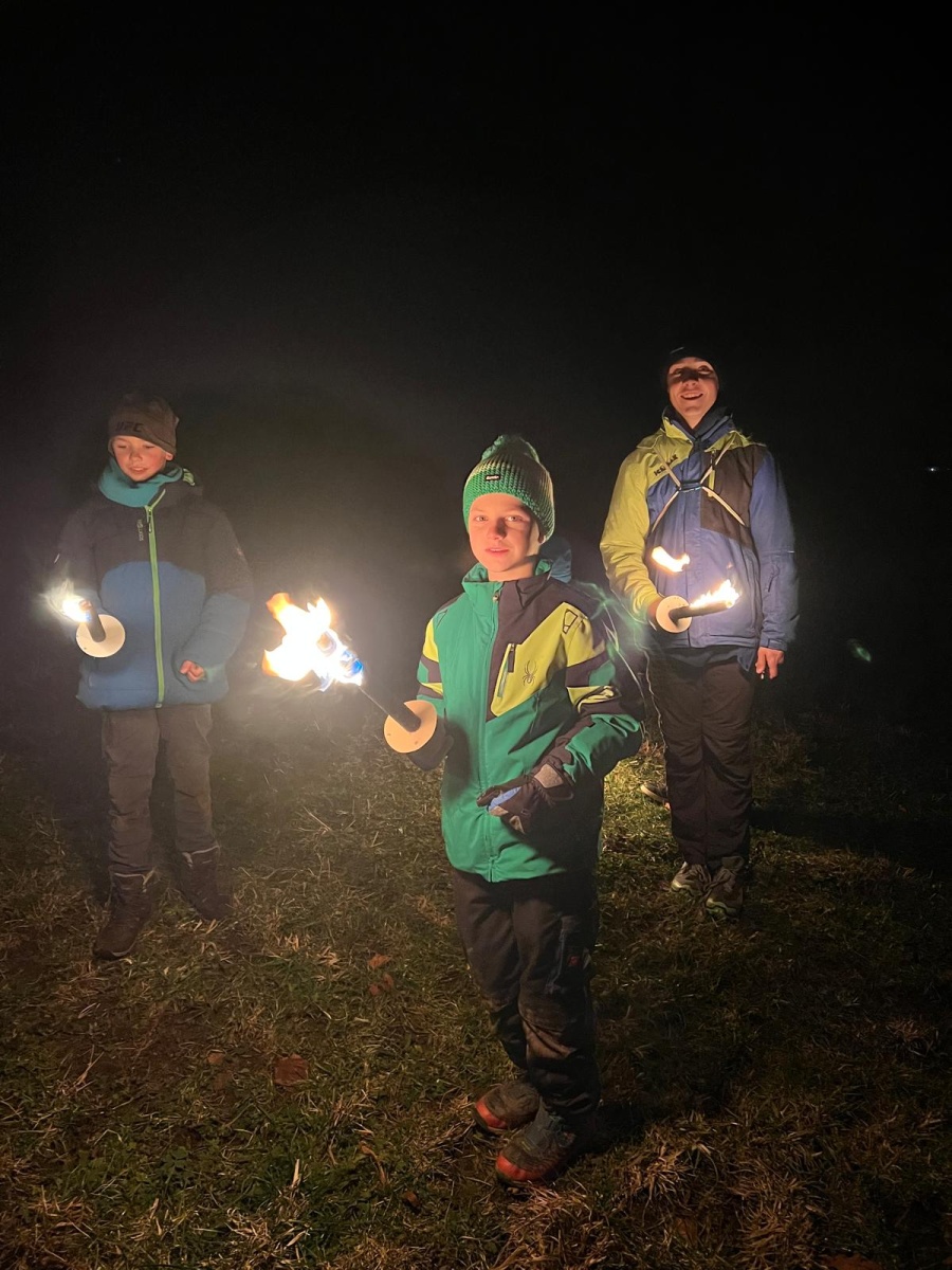Fussball, Seilspringen, Tannenzapfenweitwurf, Klettern, jeder fand eine Beschäftigung und hatte Spass, dennoch waren alle froh, als es zu Kuchen und Muffins in die Hütte zurückging. Keiner von den Kids wollte an diesem Wochenende noch einen Fuss vor die Hütte setzen, aber nach dem Abendessen, waren alle begeistert, als es zur Fackelwanderung noch einmal rausging. Der Wind machte es etwas ungemütlich und gefährlich, so landeten die Fackeln in der Grillstelle und wir lauschten bei einer wohligen Wärme den Witzen der Kinder.