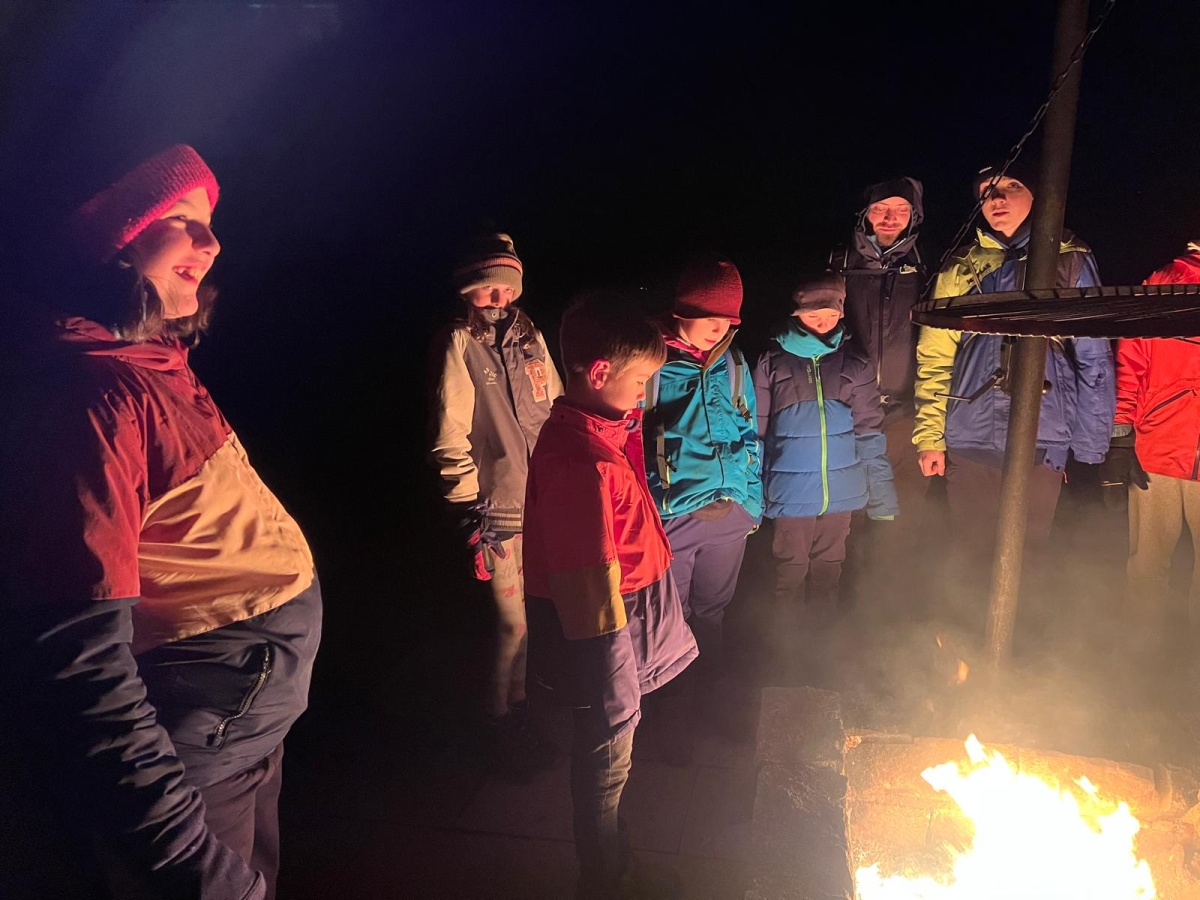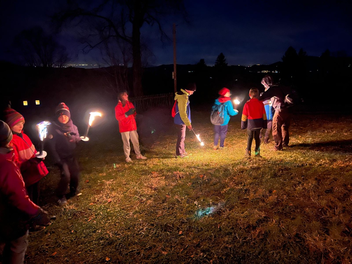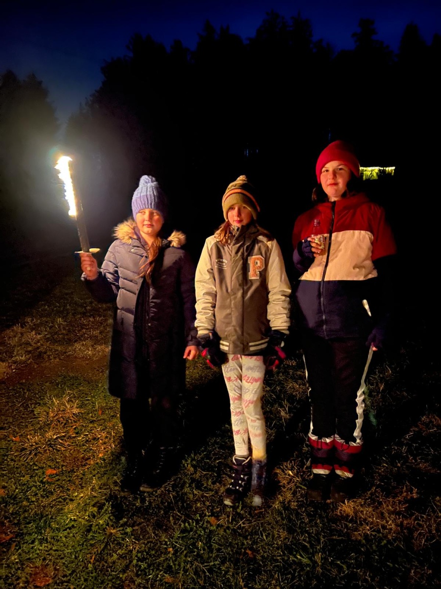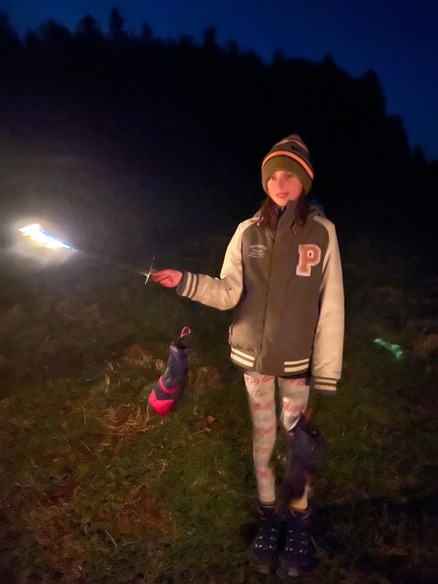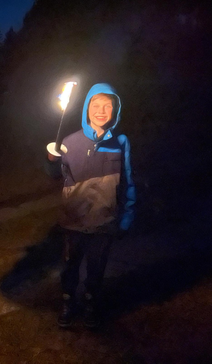 Fussball, Seilspringen, Tannenzapfenweitwurf, Klettern, jeder fand eine Beschäftigung und hatte Spass, dennoch waren alle froh, als es zu Kuchen und Muffins in die Hütte zurückging. Keiner von den Kids wollte an diesem Wochenende noch einen Fuss vor die Hütte setzen, aber nach dem Abendessen, waren alle begeistert, als es zur Fackelwanderung noch einmal rausging. Der Wind machte es etwas ungemütlich und gefährlich, so landeten die Fackeln in der Grillstelle und wir lauschten bei einer wohligen Wärme den Witzen der Kinder.